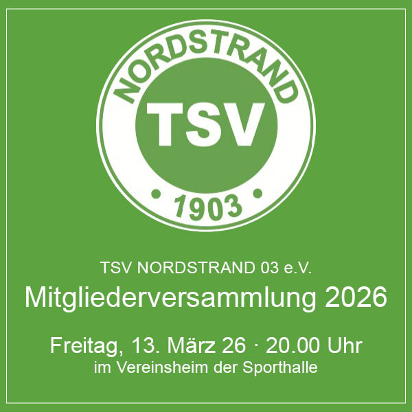 Wir laden alle Mitglieder herzlich zur Versammlung am Freitagabend, 20 Uhr im Vereinsheim ein. Anträge können bis zum 12.3. eingereicht werden, per E-Mail an sport@tsv-nordstrand.de oder bei allen Vorstandsmitgliedern.